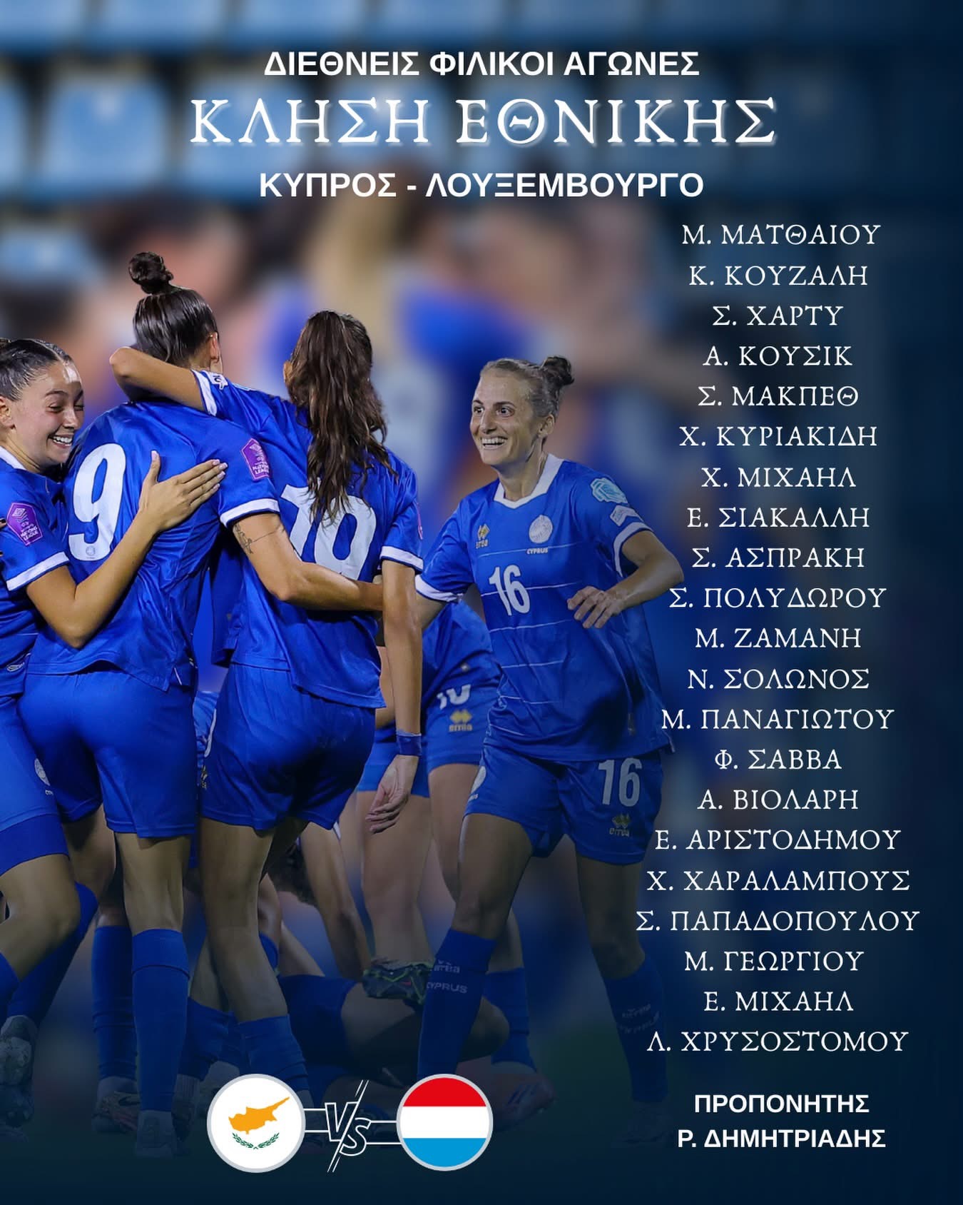 Ο ομοσπονδιακός προπονητής ανακοίνωσε την αποστολή της ομάδας, η οποία απαρτίζεται από ποδοσφαιρίστριες που διακρίνονται τόσο στα κυπριακά πρωταθλήματα όσο και σε ομάδες του εξωτερικού.